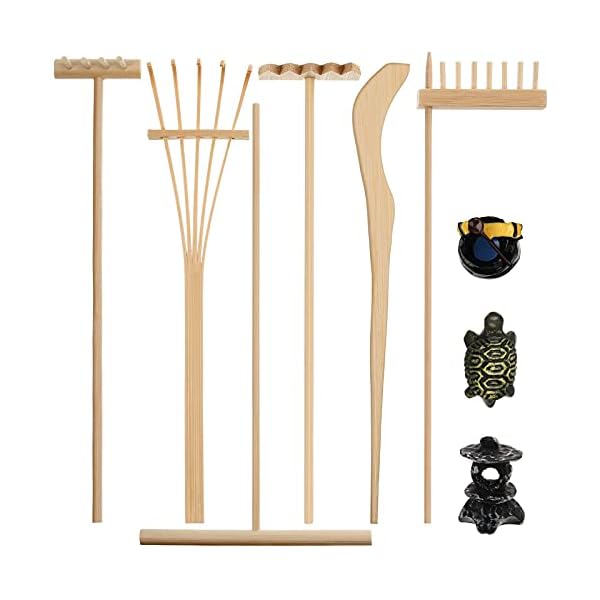 Dieser Bambus-Zen-Gartenharken und die Mini-Figuren sind wunderschön und interessant, um Ihren persönlichen Zen-Garten zu gestalten. Sie eignen sich ideal zum Dekorieren von Teetischen, Bücherregalen, Schreibtischen und Fernsehschränken, die Ihrem Zuhause, Büro und Klassenzimmer einen künstlerischen Sinn verleihen.