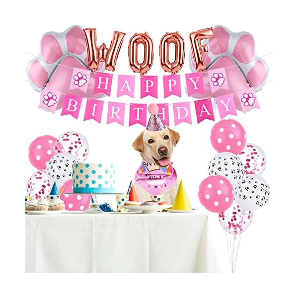 Hunde-Geburtstags-Dekorationsset – Sie erhalten 1 Stück Hundemütze, 1 Stück Hunde-Dreiecksschal, 1 Stück Hundehalsband mit Fliege, 1 Satz HAPPY BIRTHDAY-Banner, 17 Luftballons, darunter 2 Hundepfoten-Luftballons, 1 Satz WOOF-Buchstaben Luftballons.