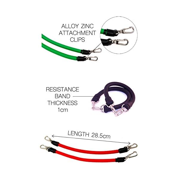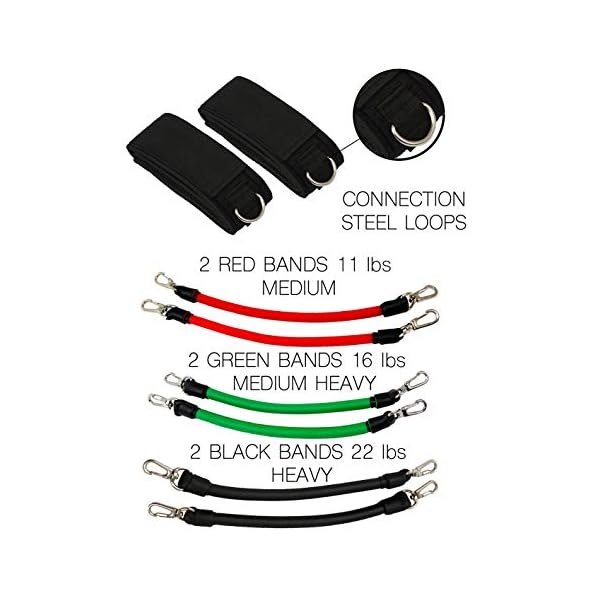 2 rote Gummibänder (7,5-8,5lbs) 2 grüne elastische Bänder (10.5-12lbs) 2 schwarze elastische Bänder (22lbs) 2 Oberschenkelriemen – 22cm Durchmesser bis 36cm Durchmesser 1 Tragetasche Jede Bandlänge ist 240mm, Latexschläuche für Krafttraining verwendet. Verstärkung – Gelenke und Knochen Flexibilität – mehr Bewegungsfreiheit Muskelkraft und Kraft Plyometrisches Training – schnellere Körperbewegungen.