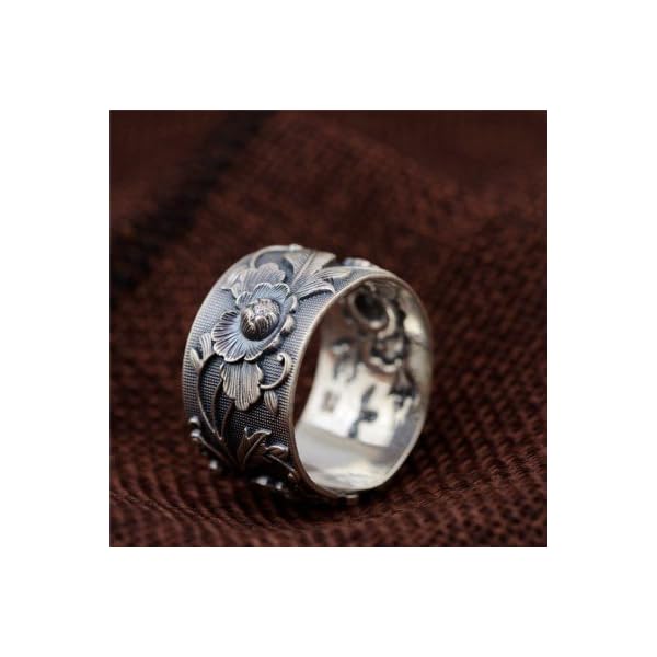 ForFox Damen Schwarz Breit 999 Sterling Silber Orientalische Pfingstrose Blume Ring 15mm Offen und Verstellbar