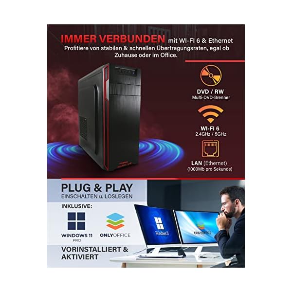 Flüsterleise Kühlung! Dank den leisen AMD Ryz 5 8- Thread CPU Kühler ( Prozessor ) und den Silent Netzteil macht die Arbeit mit unseren Officerechner wieder Spass! Unsere Allround Hardware ist mit Komponenten wie WLAN und DVD – Brenner ausgestattet und somit bestens geeignet für die Arbeit von Zuhause, Arbeit, Schul / Schule, Homeoffice / Homescooling, Business sowie für Kinder, Jugendliche und Schüler geeignet.