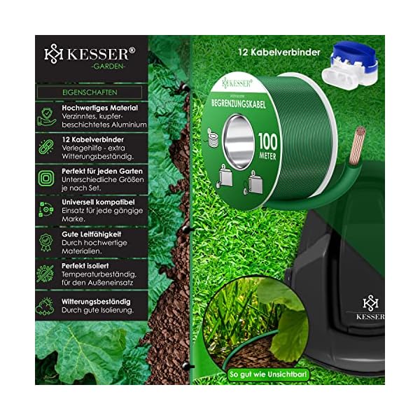 KESSER® Begrenzungskabel 100m + 12 Kabelverbinder für Mähroboter Rasenmäher Rasenroboter Zubehör Set Begrenzungsdraht Universal für Suchkabel kompatibel mit Gardena/Bosch/Worx/Einhell/Honda/ROBOMOW
