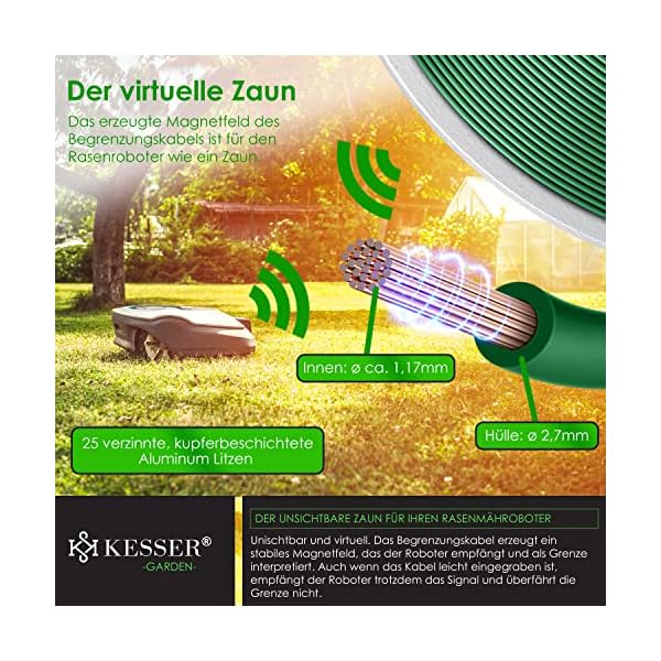 𝐀𝐔𝐓𝐎𝐌𝐀𝐓𝐈𝐒𝐈𝐄𝐑𝐓 𝐔𝐍𝐃 𝐒𝐈𝐂𝐇𝐄𝐑 𝐑𝐀𝐒𝐄𝐍𝐌Ä𝐇𝐄𝐍: Unser Begrenzungskabel wird verwendet um einen vorgesehenen Bereich zu definieren, in dem der Rasenmäher sich bewegen und den Rasen mähen soll. Die Planung und der Aufbau sind simpel und dank unserer Kabelverbinder und Rasennägel einfach umzusetzen. Sobald der Rasenroboter an das verlegt Kabel gelangt wird dieser umgeleitet oder gestoppt, sodass nur der mit dem Begrenzungskabel markierte Bereich gemäht wird.