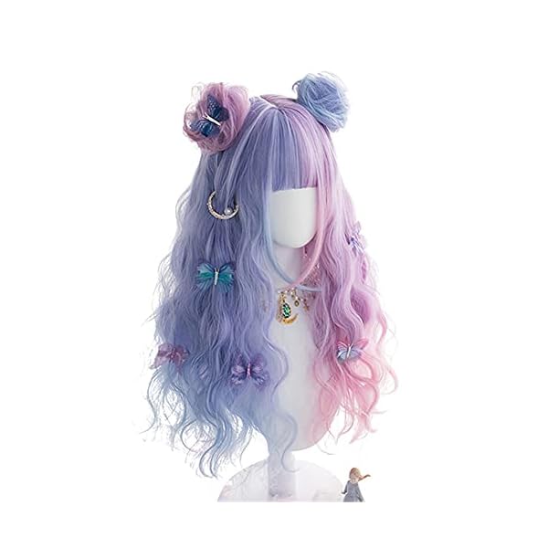 Lolita Perücke 65cm Lange Wellig Lockiges Lila Gemischtes Blau süße Cosplay Perücke Frauen Mädchen (Perücke mit Brötchen)