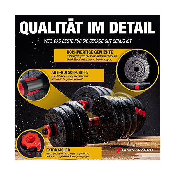 ✅ 𝗠𝗔𝗫𝗜𝗠𝗔𝗟𝗘 𝗦𝗜𝗖𝗛𝗘𝗥𝗛𝗘𝗜𝗧: Das moderne Set mit hochwertigen Gewichten aus Beton und gepolstertem Verbindungsstück für Ihr Freihanteltraining überzeugt – wie alle Sportstech-Produkte – durch höchste Qualität und Langlebigkeit. Definieren Sie Ihre Muskeln und genießen Sie Ihr effizientes Ganzkörpertraining – jetzt und auch in Zukunft!